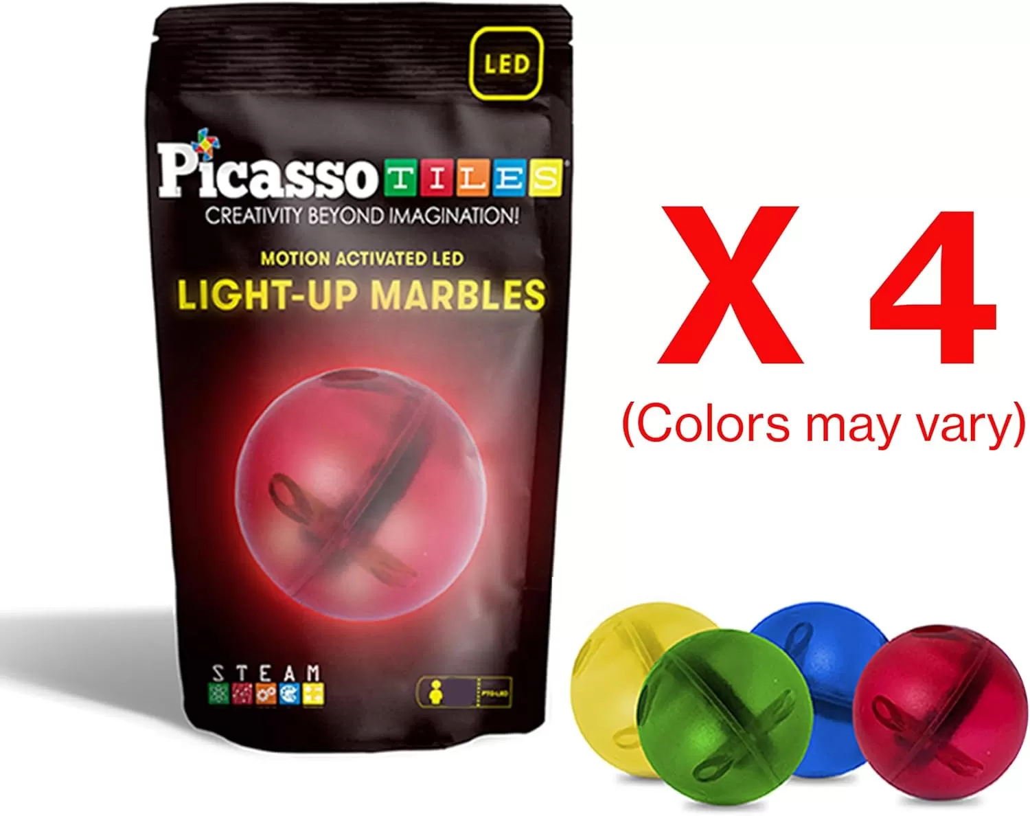 PicassoTiles 100PC Marble Run Race Track + 4PC LED Light-Up Glow in The Dark Translucent Balls: STEAM Educational Playset for Kids - Fun Learning Construction Toy, Creative Design, Sensory Development
