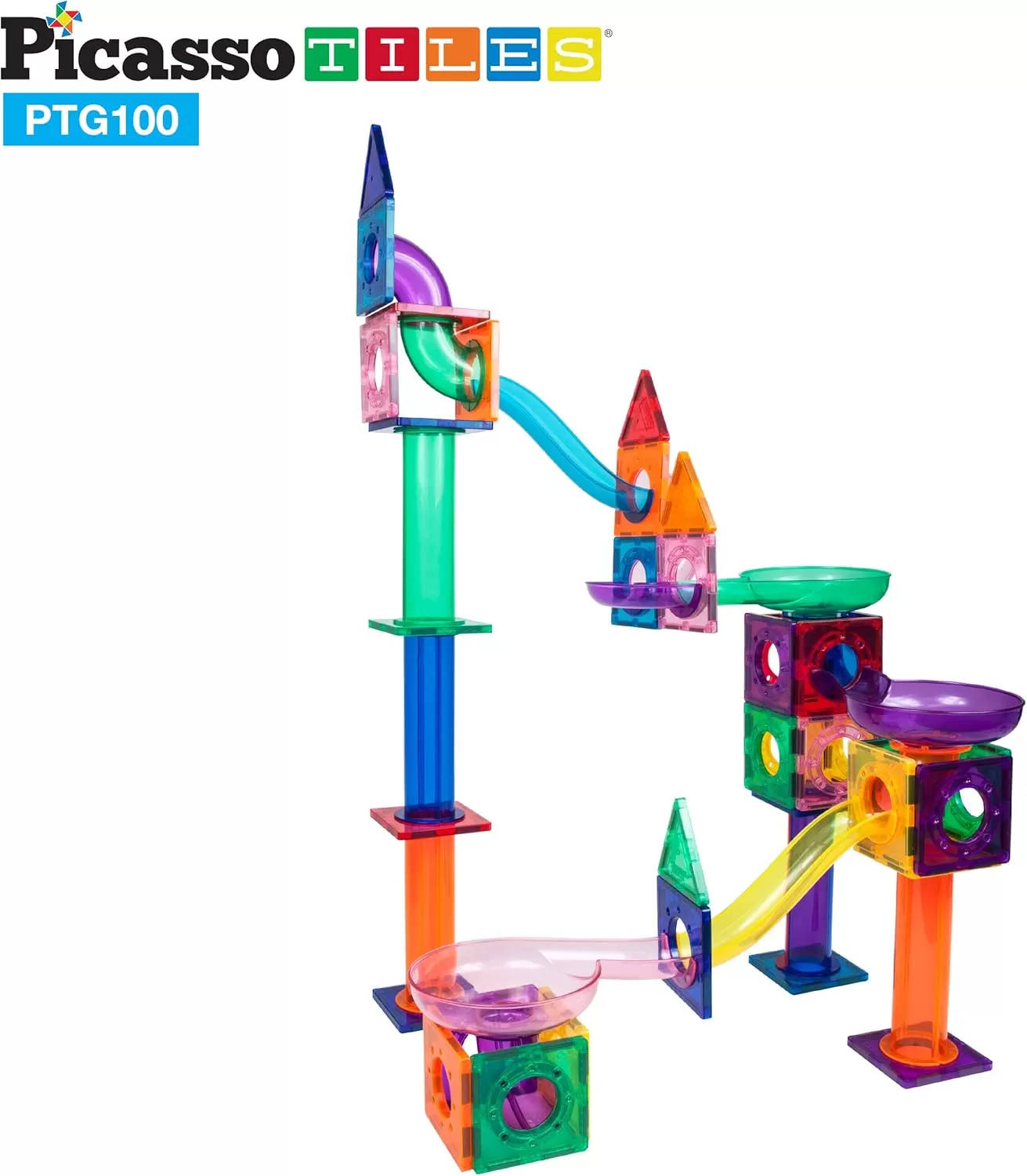 imagePicassoTiles 100PC Marble Run Race Track  4PC LED LightUp Glow in The Dark Translucent Balls STEAM Educational Playset for Kids  Fun Learning Construction Toy Creative Design Sensory Development