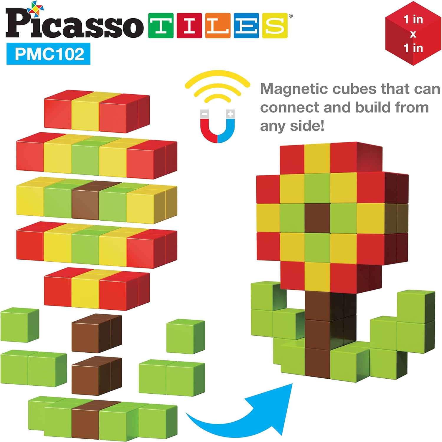 PicassoTiles Kids 1″ Pixel Magnetic Puzzle Cube 102 Piece Mix & Match Cubes w/ Free Idea Book Sensory Toys STEAM Education Learning Building Block Magnets Construction ToySet Stacking Magnet Kit