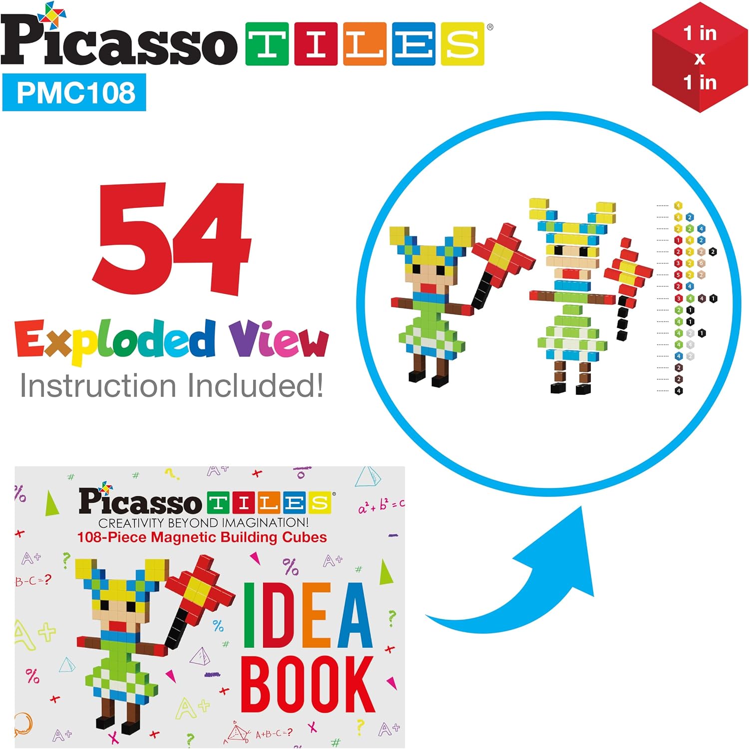 PicassoTiles 1” Magnetic Puzzle Cubes 108 Piece Magnet Construction Building Block Set Sensory Toy Early Education STEM Learning, Free Ideabook with 50 Ideas, Children Age 3+ Boy Girl PMC108