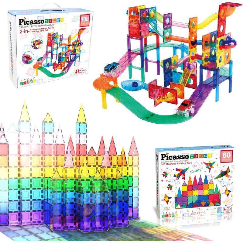 Introducing the PicassoTiles 108PC Marble Run Race Track Bundle + 60PC Magnet Tiles – a dynamic duo for STEAM learning and sensory play. Specifically crafted for preschool and kindergarten kids (Ages 3+), this engaging bundle sparks creativity and imagination. The dual playsets offer a versatile mix of magnetic construction and thrilling marble run experiences, fostering cognitive development and problem-solving skills. A classroom essential, this bundle provides a multi-sensory learning environment, making it a must-have for educators. Durable, safe, and designed for educational fun, it's the perfect gift to inspire young minds and elevate interactive learning in the classroom