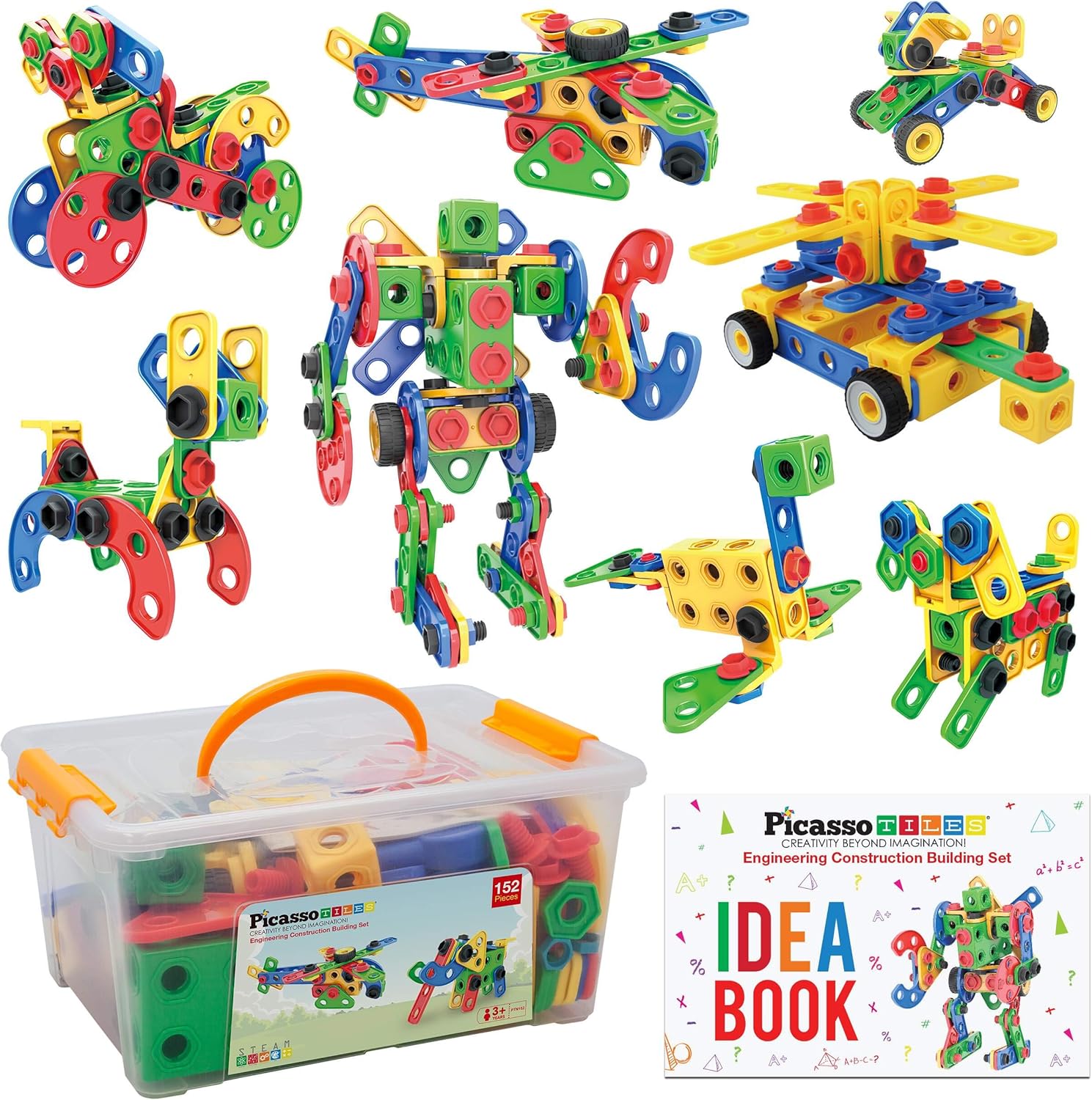 PicassoTiles STEM Learning Toys 152 Piece Building Block Set Kid Toy Construction Engineering Kit Educational Blocks w/ Idea Book Design Guide, Storage Carry Box, Power Drill, Ratchet, Age 3+ PTN152