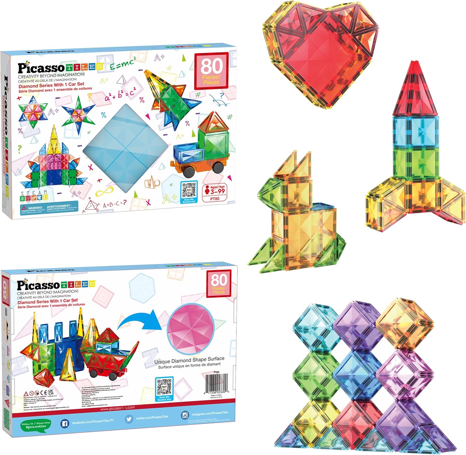 The PicassoTiles 80-Piece Magnetic Building Blocks offer a stimulating hands-on experience, promoting brain development and enhancing fine motor skills. Watch as your child explores endless possibilities, from building intricate structures to creating unique designs. These magnet toys provide an engaging and educational way for kids to learn through play. To complement the magnetic building blocks, we've included the PicassoToys Toy Carry Case – a durable and portable EVA storage organizer crafted from water-resistant Oxford cloth. This travel bag is specifically designed to accommodate the magnetic tiles, ensuring easy transportation and a clutter-free play space.