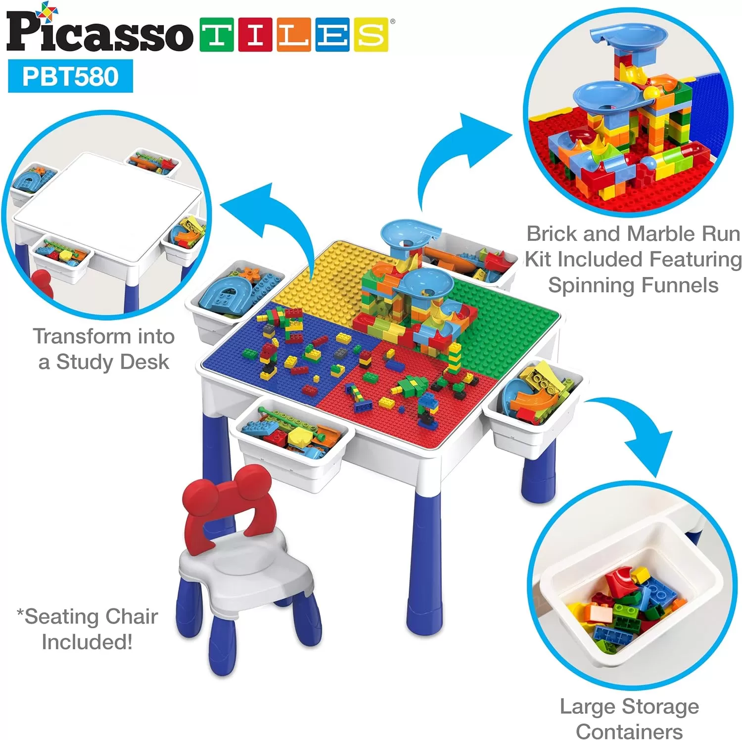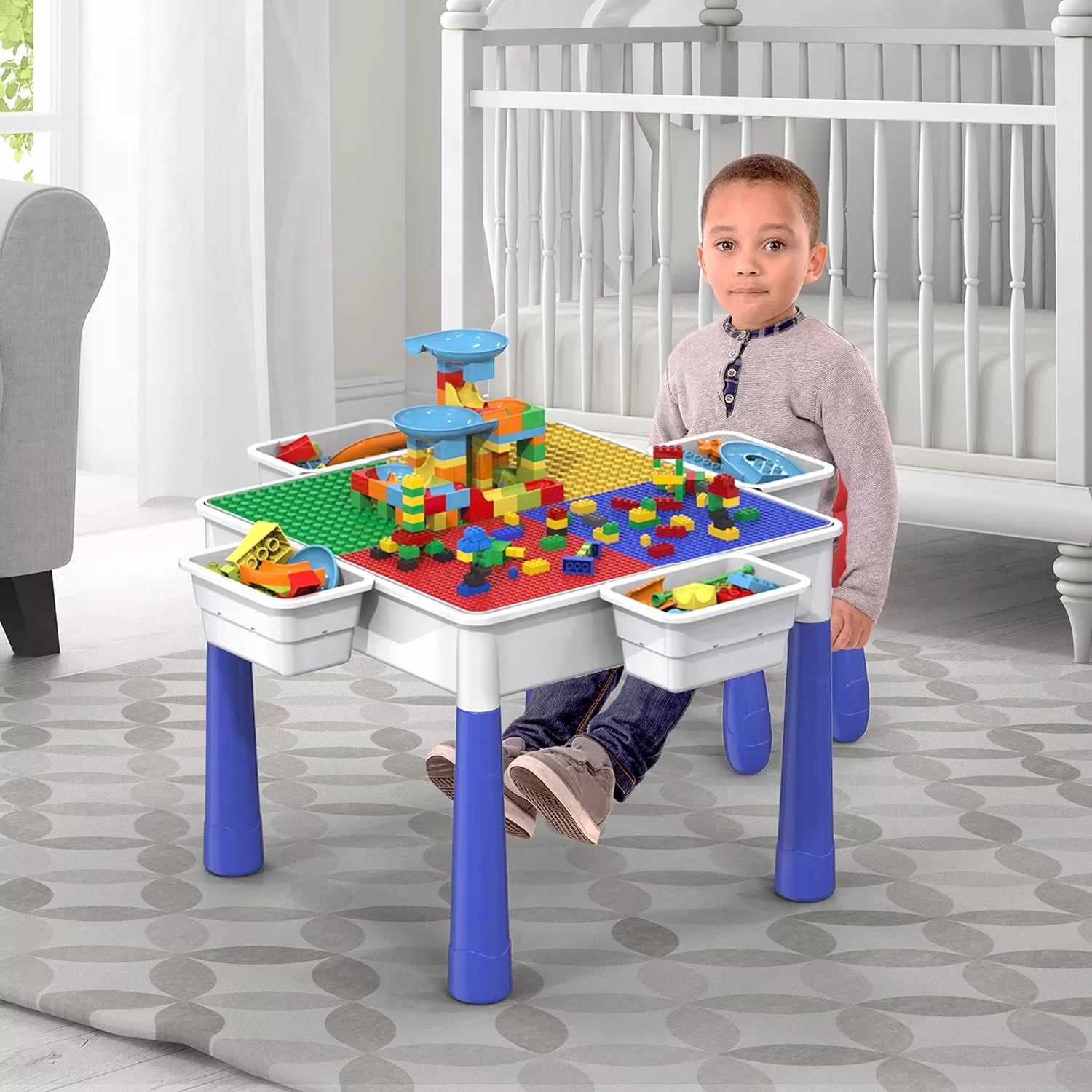 SANDBOX, STUDY DESK, WATER-TIGHT CONTAINER, MARBLERUN, & BRICK BLOCKS ALL-IN-1: Unique activity table transforms between multiple play activities. Underneath the dual side panel toy building bricks construction tabletop, features a large compartment space for storage, water playset aquatic toys, or sand box. Remove the legs to place the table top on the ground level to adjust the height setting to best fit children creativity needs. Organize the play area with 4 detachable storage bins included
