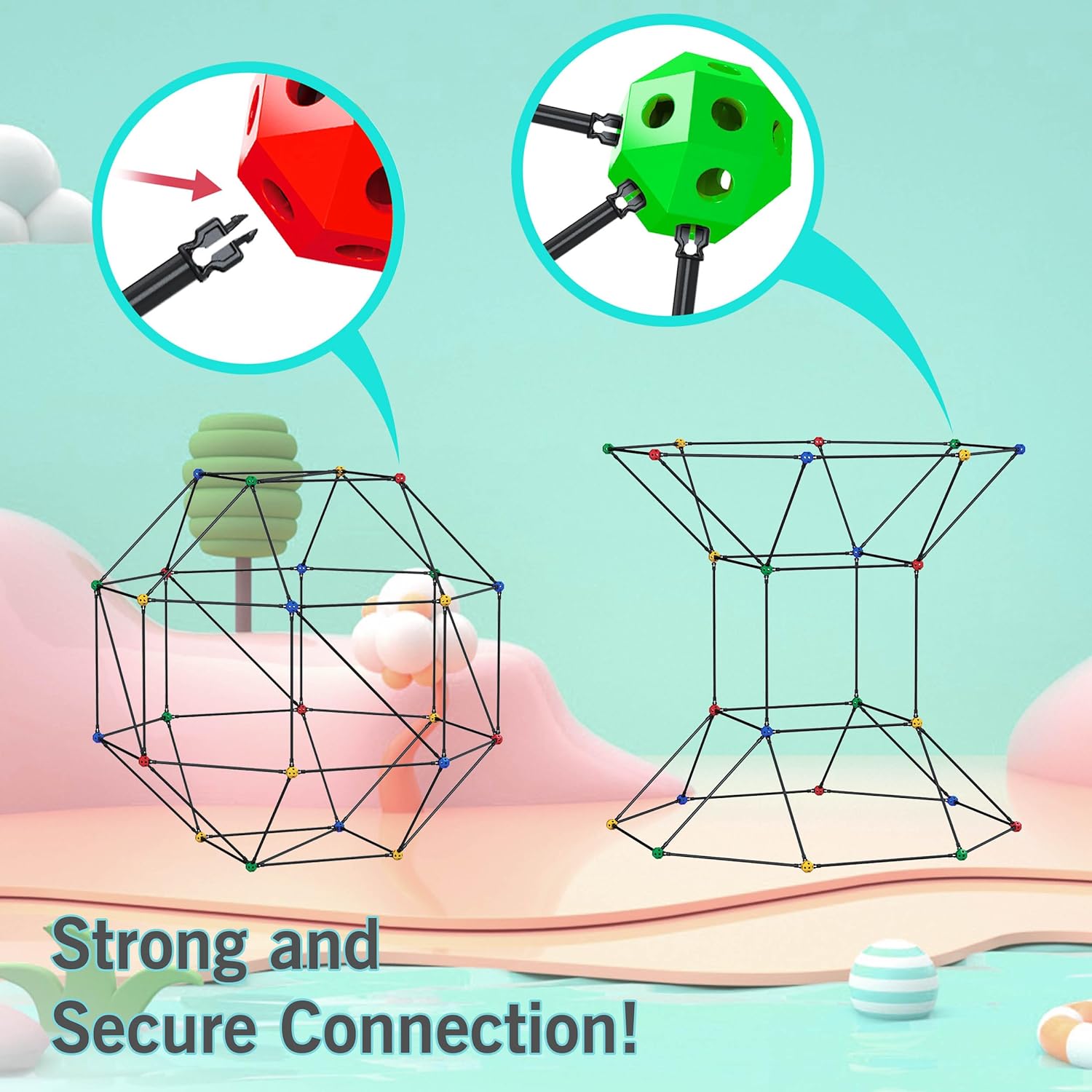 REINFORCED SNAP CONNECTOR – fort construction building kit is easy to build and durable with the updated latch clicking system. It comes with 34 colorful geometric interlocking joints in four colors, 56 connecting sticks with new locking mechanism on the two ends to secure the fort buildings, and 10 extended cross tubes to improve the stabilities. Each joint is designed with 18 snapping holes in different directions to allow kids to engineer forts in all fun shapes, structures and sizes.
