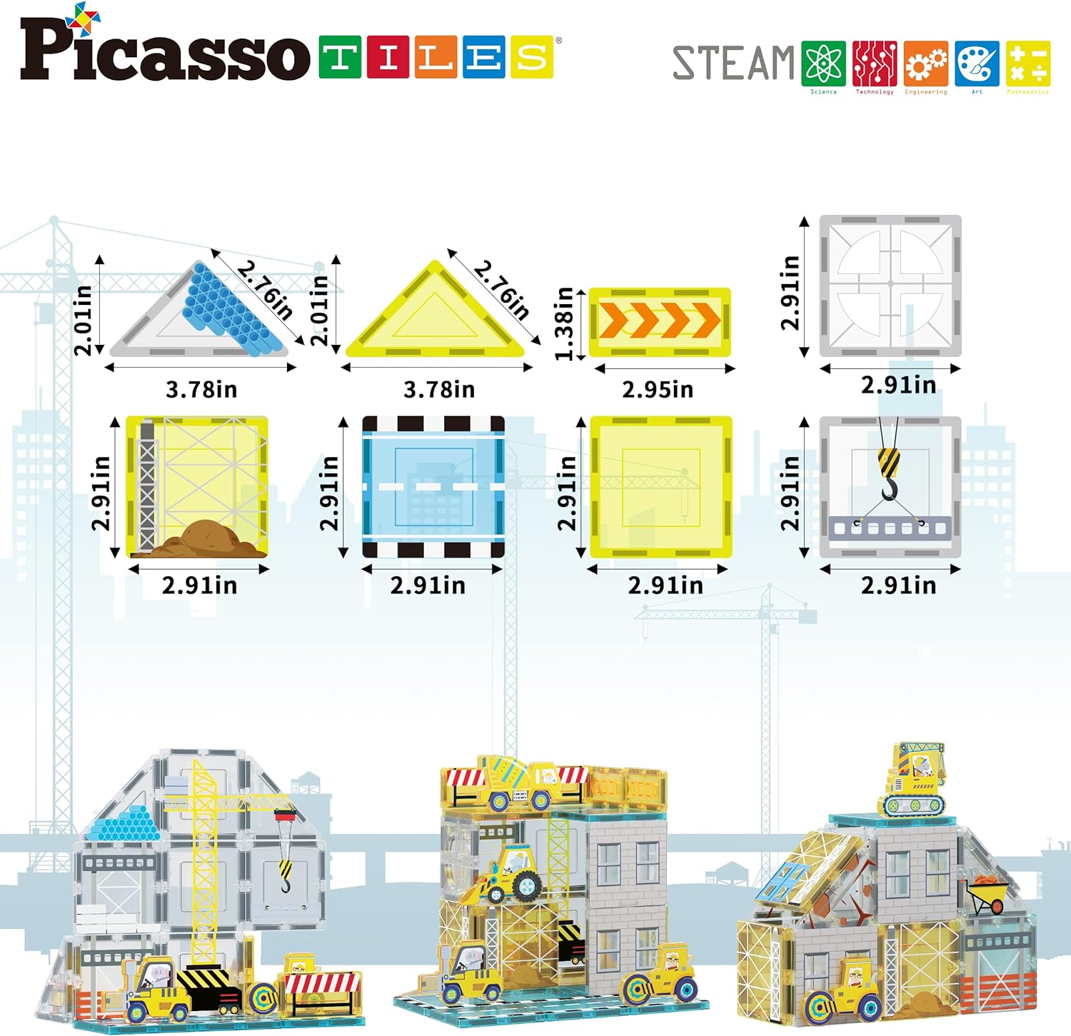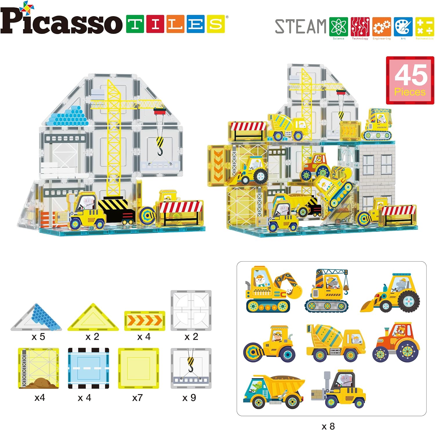 PicassoTiles Magnet Tile Building Block Set with 8 Construction Vehicles Crank Truck, Excavator, Bullsdozer, Road Roller, Concrete Mixer, Tractor, Dump Truck, & Forklift Magnetic Toy Kid Ages 3+ PTQ11
