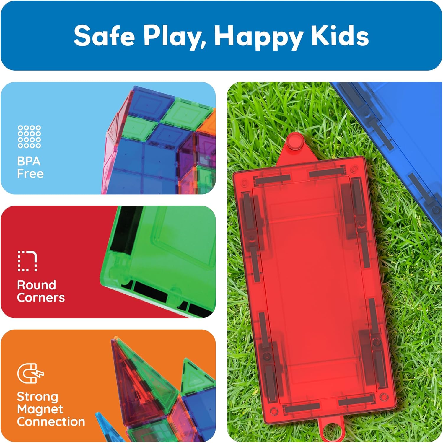 BPA-FREE & NON-TOXIC: We place safety above all else. Our PicassoTile toy sets are BPA-free and non-toxic, creating a safe environment for your child's playtime. Every magnetized tile is thoughtfully shaped with smooth edges, enhancing the protective shield against any accidental cuts or bumps. With us, you're not only guaranteeing enjoyable amusement, but also embracing the peace of mind that comes from knowing your little one’s exploration is shielded from harmful elements.