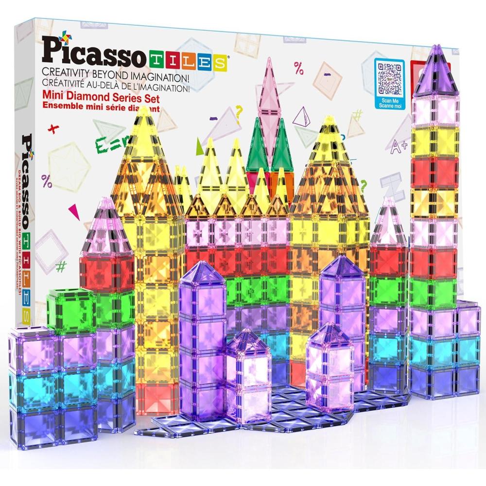 Magnetic Tiles Mini Series: The MINI series magnetic building block playset includes 40 travel-size, on-the-go tiles featuring a distinctive diamond-shaped surface. Ideal set toy from PicassoTiles to encourage toddlers creativity and STEM learning. Designed to inspire open-ended play, it encourages creativity, problem-solving, and intellectual growth in children.