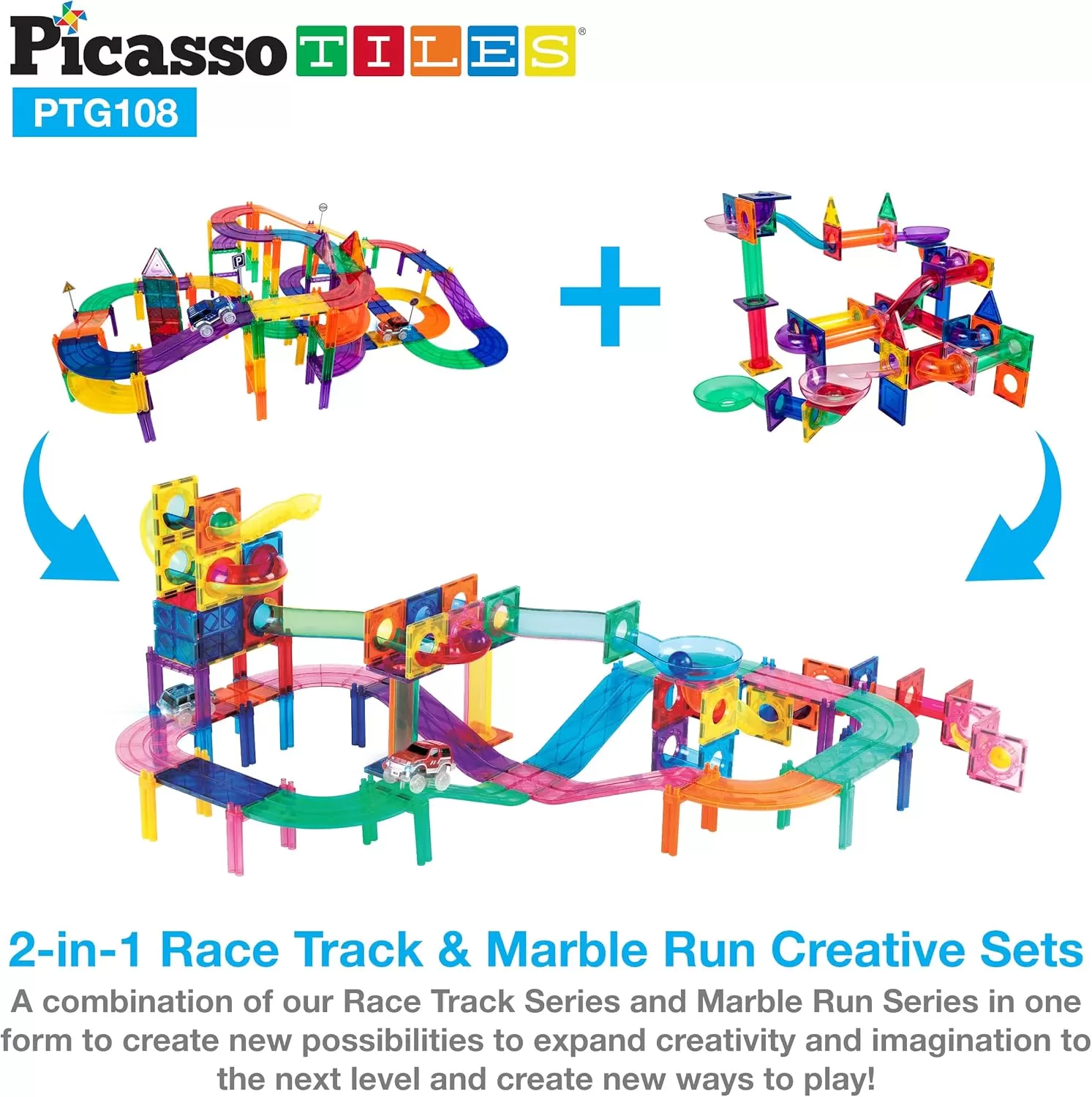 PicassoTiles 108pc 2-in-1 Marble Run Car Race Track Combo Magnetic Tiles PicassoToys Magnet Building Block Educational Construction Toy Playset STEM STEAM Learning Kit Child Brain Development PTG108, PicassoTiles 100 Piece Race Car Track Magnet Building Blocks Educational Toy Set Magnet Tiles Magnets Block Playset 2 LED Cars STEM Learning Construction Building Kit Child Brain PTR100