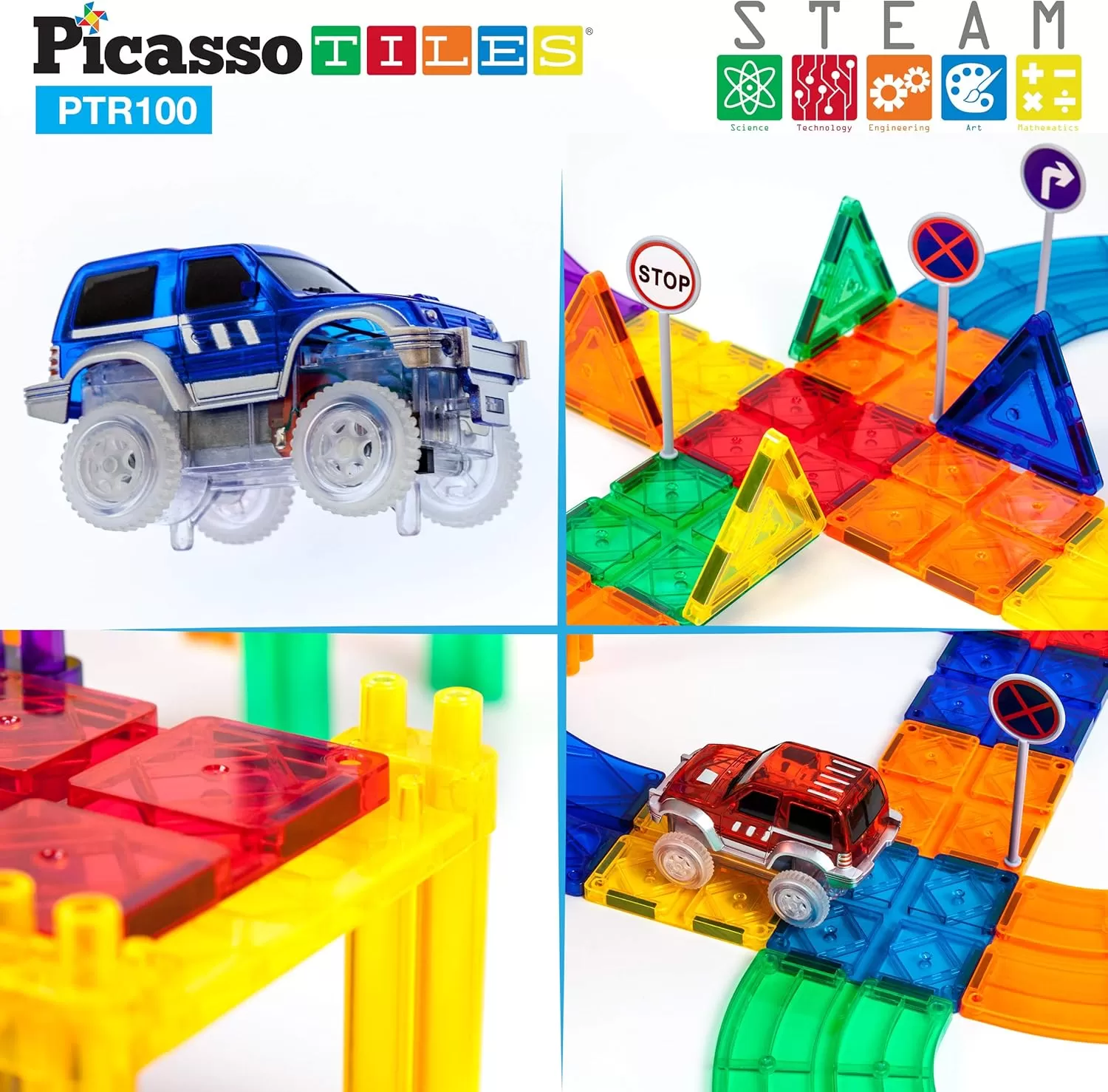 PicassoTiles 100 Piece Race Car Track Magnet Building Blocks Educational Toy Set Magnet Tiles Magnets Block Playset 2 LED Cars STEM Learning Construction Building Kit Child Brain PTR100